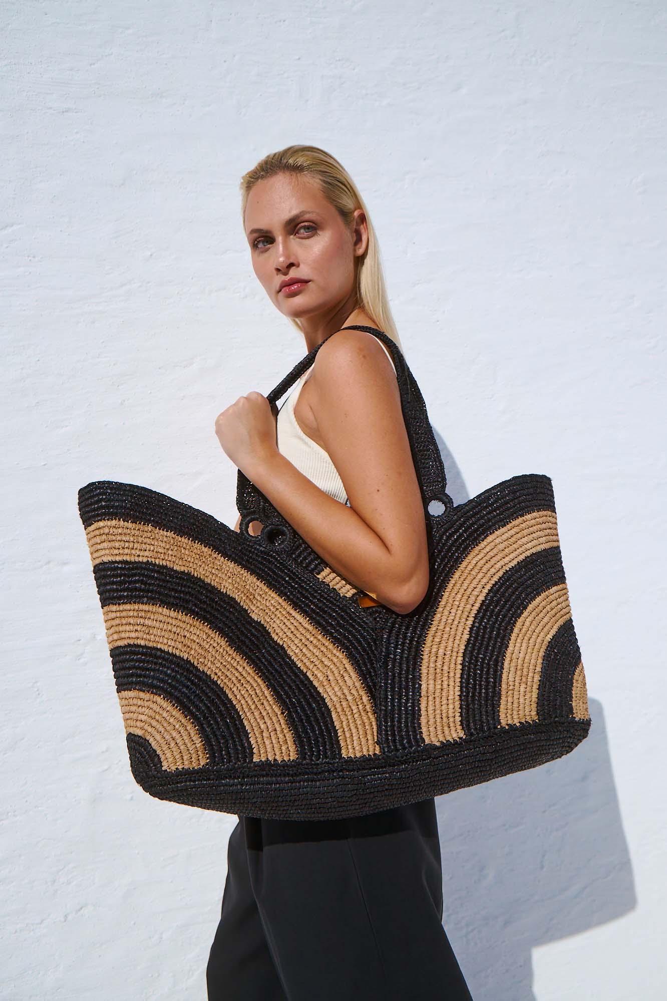 Strippy Blossom Handmade Raffia Bag – The bag comes in an oversized tulip shape which stands out. Crafted from durable raffia, this bag boasts an eye catching shape which not only adds a unique flair but also offers ample space for your essentials. Whether you are heading to the beach or enjoying a day out in the city, the bag provides a chic yet functional solution as it has ample storage space.